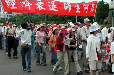據(jù)了解,這次教師大游行的訴求為“教師要團(tuán)結(jié),教師要尊嚴(yán),勞動條件要協(xié)商”,具體要求是教師可籌組工會。教師協(xié)會統(tǒng)計,此次參加游行的包括臺北縣市、高雄縣市、臺南縣市、基隆、臺中、彰化、苗栗、南投、新竹、臺東、花蓮、宜蘭、澎湖、金門、連江縣等地區(qū)的教師,加上教師家屬,游行人數(shù)達(dá)十萬以上,募集經(jīng)費一千多萬新臺幣。