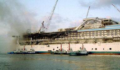 火災發(fā)生在昨日下午六時左右。正在進行內(nèi)裝修的“鉆石公主”號五層甲板首先起火,由于船內(nèi)尚未配置消防設備,未受控制的火勢迅速向上蔓延,濃煙翻滾。正在船內(nèi)施工的近千名工人聽到警報后迅速撤出,無人受傷。