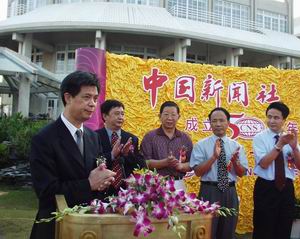中新社總編輯郭招金在慶典上致辭。他說,中新社是中國兩家通訊社之一,成立于一九五二年九月十四日,主要為港澳同胞、臺灣同胞、華人華僑服務(wù)。目前,中新社在中國內(nèi)地的二十五個省、自治區(qū)、直轄市設(shè)有五十六個分社、支社、記者站。在香港、澳門特別行政區(qū),在美國、澳大利亞、日本、法國、泰國建有分支機構(gòu),F(xiàn)在中新社每天播發(fā)新聞電訊稿一百余條,傳真圖片三十多張,中國新聞網(wǎng)每天更新新聞四五百條,中國新聞圖片網(wǎng)每天更新新聞圖片一百多幅,向海外幾十家報紙?zhí)峁⿲8搴椭谱魇邆報紙版面。