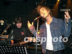 臺灣歌星任賢齊,10月13日一頭金發(fā)和牛仔裝在香港一家以男士為主的酒吧舉辦的“舉杯Party”上演唱。中新社圖 任晨鳴 攝
