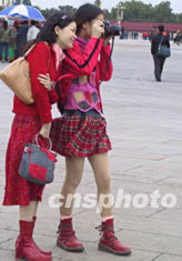 十月十八日,北京在經(jīng)歷一場秋雨后氣溫驟降,最高溫度十?dāng)z氏度,最低溫度三攝氏度。在天安門廣場旅游的兩位紅裙女孩頂風(fēng)冒雨仍興致盎然。作者:廖文靜