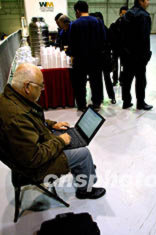 22日,一名美國記者在芝加哥奧黑爾機(jī)場休息室里,搶發(fā)中國國家主席江澤民訪問美國飛抵芝加哥的現(xiàn)場新聞。作者:王瑤