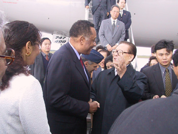 江主席的夫人王冶坪、中國國務(wù)院副總理錢其琛和夫人周寒瓊等陪同人員同機(jī)抵達(dá)休斯敦。