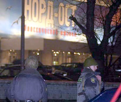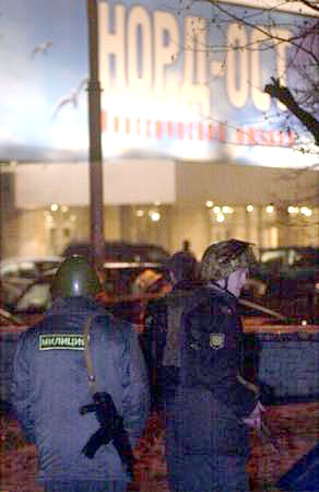 莫斯科時間23日晚間(北京時間24日凌晨),大約40-50名車臣武裝分子劫持了莫斯科市一家劇院,將700多人扣為人質(zhì),已經(jīng)釋放部分人質(zhì)。圖為警察在劇院外警戒。(春風(fēng))