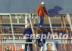 北京工人們十月底在天安門廣場安裝大型字牌,準備迎接中共十六大的召開。作者:滿會喬