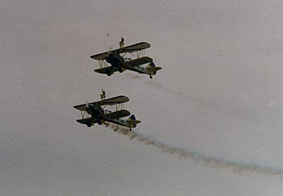 這屆展會(huì),英國(guó)UBB空中雜技表演隊(duì)駕駛老式波音-斯蒂曼爾雙翼機(jī)首次作了精彩的空中雜技表演。這屆航展,雖然一直天氣惡劣、雨絲綿綿,但各國(guó)空中勇士們?nèi)匀桓?jìng)技藍(lán)天,中國(guó)陸軍航空兵也多次冒雨進(jìn)行飛行表演,但為保證絕對(duì)安全,部分表演隊(duì)基本上困守在地面。由于各種航展設(shè)施已進(jìn)一步完善,加上雨天觀眾稀少,所以這屆航展秩序良好。(遠(yuǎn)林)
