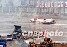 也就是30多秒的時(shí)間,時(shí)速達(dá)60公里的高速水翼船已航行到導(dǎo)流明渠上、下兩個(gè)截流戧堤之間。