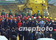 全國(guó)人大常委會(huì)委員長(zhǎng)李鵬六日到長(zhǎng)江三峽導(dǎo)流明渠截流工地看望工人,并與工人們合影留念。作者:宋吉河