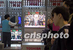 中共十六大十一月八日清晨在北京開幕,北京市民在商場(chǎng)觀看開幕式。作者:張宇