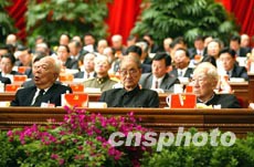 中國共產(chǎn)黨第十六次全國代表大會八日上午在北京人民大會堂舉行,萬里、宋平、薄一波(從左至右)等老同志在主席臺就座出席開幕會。作者:毛建軍