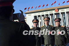 出席中共十六大的三名將軍代表在北京人民大會堂前合影留念。作者:滿會喬