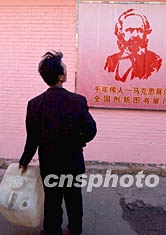 北京的一名勞動者被小街邊紅色馬克思畫像所吸引。日前閉幕的中共十六大宣布堅持馬克思主義,這位大胡子的無產階級革命導師依然是世界最大政黨的偶像。作者:賈國榮
