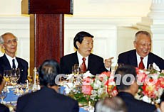 今晚的香港禮賓府華燈齊放,氣氛熱烈而溫馨。當(dāng)朱镕基總理和夫人勞安在香港特區(qū)行政長(zhǎng)官董建華和夫人董趙洪娉的陪同下步入宴會(huì)廳時(shí),在場(chǎng)的香港各界人士報(bào)以熱烈的掌聲。朱镕基總理也微笑著鼓掌向大家致意。