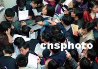 于1999年首次擴招的大學(xué)生,明年將面臨就業(yè)。2003年作為我國第一個畢業(yè)生高峰年,應(yīng)屆畢業(yè)生達到212萬人,比2002年增加67萬人,增幅45%,而社會需求則并未增加。隨著21日畢業(yè)生就業(yè)工作正式開始,首批擴招大學(xué)生將面臨嚴峻的就業(yè)競爭形勢。圖為23日在上海舉行的應(yīng)屆畢業(yè)生洽談會上,場面火爆,現(xiàn)場招聘人員“手”不暇接。李江松 攝