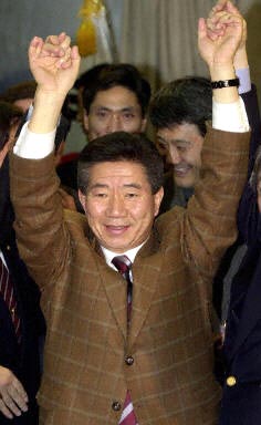 11月25日,在韓國(guó)漢城,韓國(guó)執(zhí)政的新千年民主黨總統(tǒng)候選人盧武鉉歡呼擊敗總統(tǒng)候選人、韓國(guó)足球協(xié)會(huì)主席鄭夢(mèng)準(zhǔn)。雙方此前約定根據(jù)對(duì)選民的民意調(diào)查來確定其中一人參加將于12月9日舉行的總統(tǒng)大選。根據(jù)11月24日的調(diào)查顯示,盧武鉉的支持率為百分之四十六點(diǎn)八,而后者為百分之四十二點(diǎn)二。鄭25日宣布退出大選,支持盧武鉉。