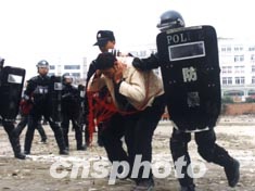 中新社成都十一月二十六日電(記者楊杰)二十多名鬧事者企圖沖擊A國駐蓉辦事處,事態(tài)正在擴(kuò)大之中,消息瞬間即傳到屬地公安分局指揮室,一場恐怖與反恐怖的較量就此拉開帷幕。這是今天下午成都市反恐怖演習(xí)行動開始時的情景。有關(guān)方面的官員到現(xiàn)場觀摩了整個演習(xí)行動。