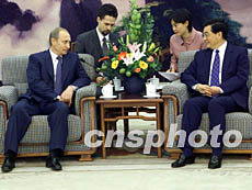 胡錦濤首先對普京的來訪表示熱烈歡迎。他說,值中國共產(chǎn)黨十六大召開不久在北京與總統(tǒng)閣下再次見面感到非常高興。去年十月,他應邀訪問俄羅斯,總統(tǒng)閣下關(guān)于國際形勢等問題的見解給他留下很深印象。那次訪問時間雖短,但情形仍“歷歷在目、記憶猶新”。