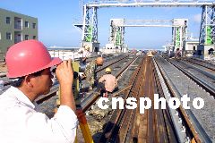 12月2日,隨著最后一根長(zhǎng)25米的特制鐵軌,成功鋪設(shè)在粵海鐵路南港棧橋橋面,全長(zhǎng)8738米的粵海鐵路南港棧橋鐵軌與?诨疖囌捐F軌接軌。至此,中國(guó)第一條跨海鐵路粵海鐵路南北港碼頭鐵路線全線貫通。圖為施工人員在南港棧橋上進(jìn)行測(cè)量和鋪軌工作。古月 攝