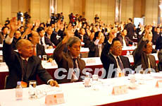 會(huì)議首先以舉手表決的方式通過(guò)了總監(jiān)票人、監(jiān)票人名單。總監(jiān)票人為曹其真,監(jiān)票人為:容永恩、唐志堅(jiān)、黎振強(qiáng)、霍麗斯、顏延齡。