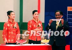 在祥和的中國(guó)民樂(lè)聲中,來(lái)自北京大學(xué)的女大學(xué)生將印有中國(guó)香港、中國(guó)澳門和中國(guó)臺(tái)北三隊(duì)英文字樣的字條從玻璃碗中一一取出,“找到”了各隊(duì)的組別位置。這三支球隊(duì)將分別參加第十三屆亞洲杯足球賽預(yù)賽第一階段D、E、B三組的比賽,爭(zhēng)取殺入第二階段預(yù)賽(既資格賽)。