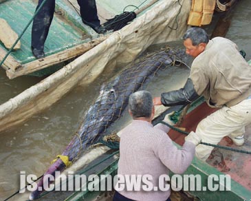 中新網(wǎng)南京12月12日電(記者陳光明 丁東升)冬日下的長(zhǎng)江江面依然是寒風(fēng)凜冽。南京下關(guān)漁政碼頭的江岸邊,今天上午站滿了翹首遠(yuǎn)望的市民——他們關(guān)切和憂慮的目光投向江邊一艘漁船邊掛著的魚(yú)網(wǎng)里邊的“國(guó)寶”級(jí)動(dòng)物——白鱘。這是漁民孫永來(lái)昨天下午二時(shí)左右在長(zhǎng)江下關(guān)潛洲以北的江面上捕捉到的。