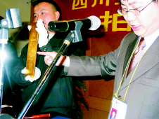 今天上午9點,距離正式開拍還有一個小時,設在成都人和賓館會議室里的拍賣現場已是人聲鼎沸,從全國各地趕來的多家媒體紛紛搶占有利地形,而“競拍席”上的買家則在最后時刻才神秘亮相。此前記者獲知,組織此次拍賣的四川金通拍賣行一直對參與競拍的三家企業(yè)避而不談,只透露其中有著名電器銷售公司成都國美電器,而另兩家則是四川本省的企業(yè),但是在競拍現場記者注意到,只有代表成都國美電器的28號競買者比較活躍,而另外兩家企業(yè)的競買人卻出人意料地沒有舉牌參加競買,結果,在開場20分鐘后兩塊金錠就毫無懸念的以底價62萬元被拍出。