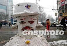 鬧市街頭堆起一座士兵雪人,為即將來臨的圣誕節(jié)和元旦節(jié)增添情趣。作者:賈國榮