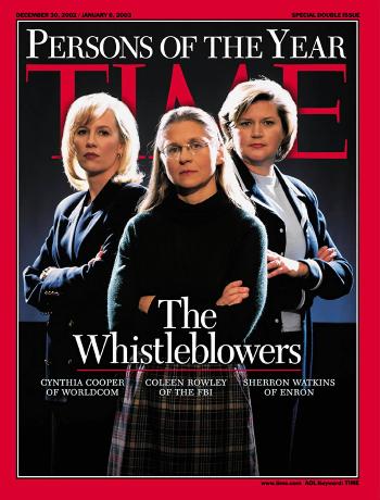 她們分別是強(qiáng)調(diào)喪失有可能避免“九一一”發(fā)生之機(jī)的聯(lián)邦調(diào)查局干員科琳·羅利;揭發(fā)電信巨擘世界通訊公司、曾是美國(guó)第七大能源交易商安龍公司弊端,導(dǎo)致公司破產(chǎn)的辛西婭·庫(kù)珀與莎朗·沃特金斯。