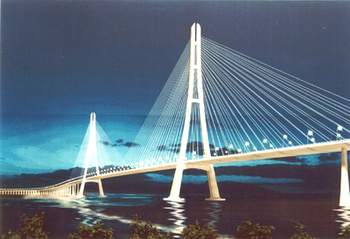 該橋全長(zhǎng)約十五點(diǎn)六公里,主跨跨徑六百四十八米,設(shè)計(jì)為六車道高速公路。工程投資概算二十九點(diǎn)六億元,工期四年,計(jì)劃于二00六年底建成通車。