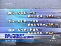 據(jù)中央電視臺(tái)報(bào)道,2003年1月1日起,重組后的國(guó)航、東航、南航三大民航運(yùn)輸集團(tuán)的航班代號(hào)將分別統(tǒng)一為CA、MU和CZ,同時(shí)西南航、中航、西北航、云南航、北方航、新疆航原有代號(hào)將不再使用。統(tǒng)一航班代號(hào)后,三大航空集團(tuán)的飛機(jī)也將分別統(tǒng)一標(biāo)志和名稱(chēng),常旅客計(jì)劃也將實(shí)現(xiàn)內(nèi)部統(tǒng)一,擴(kuò)展了常旅客會(huì)員累積里程和兌換獎(jiǎng)勵(lì)的航班范圍。同時(shí)三大運(yùn)輸集團(tuán)還將分別統(tǒng)一航空餐食標(biāo)準(zhǔn)。為了保證航班運(yùn)行正常和平穩(wěn)過(guò)渡,三大集團(tuán)近期不會(huì)對(duì)航班計(jì)劃和航線(xiàn)布局做大的調(diào)整。
