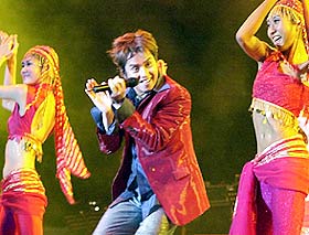 后來(lái),阿倫索性就直接叫觀眾都來(lái)到臺(tái)前和他一起party,大家也響應(yīng)號(hào)召,沖到舞臺(tái)前。只可惜歌迷只在那里逗留一首歌曲的時(shí)間,就被值勤的看守員“趕”回座位。