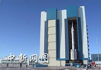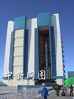 中國酒泉衛(wèi)星發(fā)射中心總裝測試廠房中巍然聳立的“神舟”“神箭”組合體:“神舟”為中國載人航天工程進(jìn)行第四次飛行試驗(yàn)的飛船;“神箭”即中國運(yùn)載火箭技術(shù)研究院研制的“長征二號(hào)F”運(yùn)載火箭。中新社記者 孫自法 攝