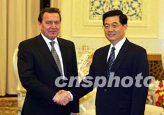 中共中央總書記、國家副主席胡錦濤三十日在北京人民大會堂會見德國總理施羅德。作者:毛建軍