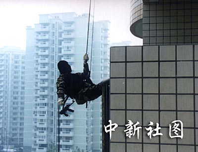 26日,成都首次反恐怖演習(xí)。在處置恐怖分子對某跨國公司辦公大樓實施的劫持人質(zhì)的演習(xí)中,特警秘密潛入大樓,準(zhǔn)備伺機行動。作者:劉真