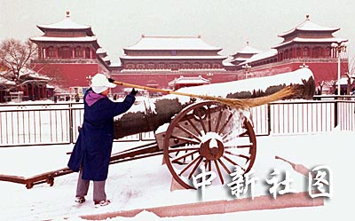 北京連續(xù)六天降雪創(chuàng)下百年紀(jì)錄。二十四日,京城終于雪過天晴,一位保潔工人正在故宮午門前清掃神威大炮上的積雪。作者:張煒