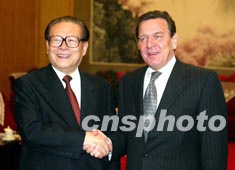 中國(guó)國(guó)家主席江澤民三十日在北京中南海會(huì)見來訪的德國(guó)總理施羅德。作者:毛建軍