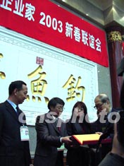 來自世界各地的華人企業(yè)家三日在北京釣魚臺(tái)舉行新春聯(lián)誼會(huì)。全國政協(xié)副主席孫孚凌(右一)到會(huì)為多名貢獻(xiàn)突出的華人頒發(fā)“華人企業(yè)家證書”。作者:王麗南