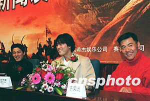 總投資七百萬美元、有韓國版《英雄》之稱的《武士》四日在北京舉行中國首映禮,欲與熱播中的《英雄》一爭高下。圖為片中主角韓國當(dāng)紅影星朱鎮(zhèn)模、鄭宇盛、與中國影星于榮光(從左至右)與北京媒體見面。作者:武仲林