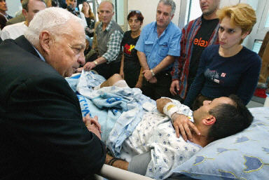 兩名巴勒斯坦人5日傍晚在交通高峰期在特拉維夫市中心區(qū)發(fā)動自殺炸彈襲擊,造成二十五人死亡,約一百人受傷。圖為以色列總理沙龍到醫(yī)院看望受傷人員。