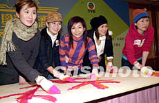 大型慈善籌款節(jié)目「慈善星輝仁濟(jì)夜」1月8日在香港舉行記者會,藝員葉璇、張美妮、朱凱婷、姚嘉妮、劉曉彤(圖左起)在會上“即席揮毫”作畫。鄧慶樂 攝