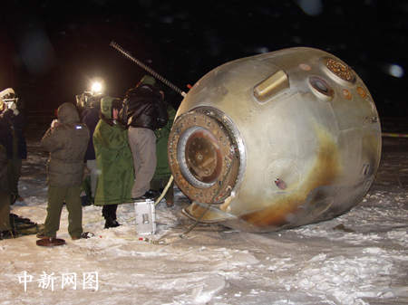 2003年1月5日,返回艙在太空中運(yùn)行六天零十八小時(shí)、繞地球108圈后,在內(nèi)蒙古中部預(yù)定區(qū)域準(zhǔn)確著陸。孫陽 攝