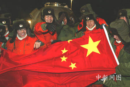 2003年1月5日,返回艙成功著陸,著陸場(chǎng)內(nèi)一片歡騰景象。孫陽 攝