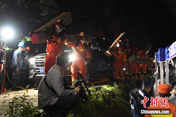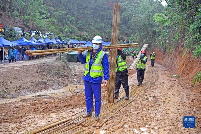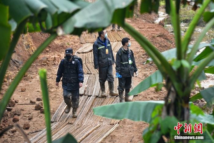 墜機(jī)事故現(xiàn)場下雨 工作人員鋪設(shè)竹排小道