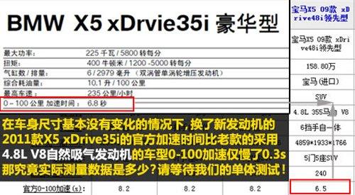 下面就說到我們的重點了,此次2011款寶馬X5xDrive35i車型在發(fā)動機上采用了型號為N55B30的單渦輪增壓發(fā)動機,這套發(fā)動機系統(tǒng)也是寶馬最新研發(fā)出來的,之前在國內(nèi)的車型上僅有5系GT車型使用。特別需要說明的是這款發(fā)動機在搭配在車輛上后使得2011款寶馬X5的百公里加速僅需6.8S,僅比老款的4.8L V8發(fā)動機版的車系慢0.3S,但究竟實際加速度是多少呢?還要等我們的單獨測試后才知道。