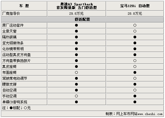 日前,備受關(guān)注的奧迪兩廂運(yùn)動型轎車全新A3正式進(jìn)口到國內(nèi)銷售,首發(fā)的兩款奧迪A3 Sportback首發(fā)限量版車型售價分別為29.8-31.8萬元。全新A3國內(nèi)的上市,結(jié)束了寶馬 1系一枝獨(dú)秀的局面,讓豪華運(yùn)動型小車的競爭進(jìn)入了白熱化。寶馬120i自動型是目前整個寶馬1系中銷量最大的車型,28.8萬元的售價與奧迪A3 Sportback首發(fā)限量版5門舒適型價格僅相差1萬元。那么關(guān)注這兩款車型的消費(fèi)者究竟該如何選擇呢?