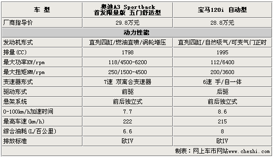 兩款車型的定位均為豪華運(yùn)動型轎車,在性能方面自然互不相讓。通過上表我們可以清楚的看到,奧迪A3 Sportback首發(fā)限量版在性能上超越了寶馬120i,而寶馬120i憑借車身前后50:50的配重贏在了操控性上。奧迪A3 Sportback首發(fā)限量版搭載了7速雙離合變速器,這種變速器能更好的發(fā)揮發(fā)動機(jī)的性能,體積更輕并且比手動擋車型更省油。