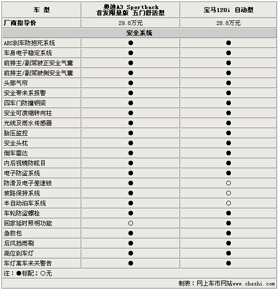 作為高品質(zhì)的德系緊湊型兩廂運(yùn)動小車,兩款車型在安全性方面均體現(xiàn)了很高的水準(zhǔn)。除了在這個級別中常見的前排正/側(cè)以及頭部安全氣簾外,奧迪A3 Sportback首發(fā)限量版在安全方面的配置要高于寶馬120i,也顯得更為豐富周全。奧迪A3 Sportback首發(fā)限量版所配備的:防滑電子差速鎖、坡路保持以及半自動泊車系統(tǒng)是既安全又實(shí)用的配置。