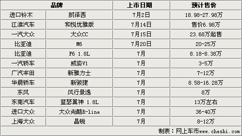 7月份上市的新車型中聚集了眾多知名大品牌。譬如一汽大眾、進(jìn)口大眾、廣汽豐田等。而按照車型細(xì)分,其中涵蓋小型車、緊湊級車、以及中級車備受關(guān)注的SUV車型等,其中自足品牌占據(jù)了一半,達(dá)到了6款車型,分別是江淮和悅優(yōu)雅版比亞迪M6和F6 1.8;威姿V1;新駿捷;風(fēng)行景逸,合資車型一汽大眾CC;新雅力士;三菱翼神;晶銳,進(jìn)口車型鈴木凱澤西;尚酷R-line,共計(jì)12款車型。