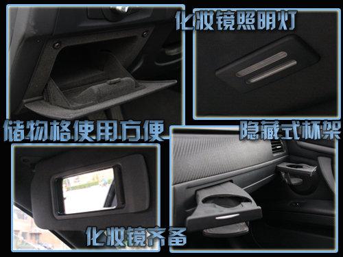 在燈光調(diào)節(jié)的下方設(shè)計有獨立的儲物空間;副駕駛位置在銀色提示條下隱藏著兩個水杯架;兩側(cè)的遮陽板都設(shè)有化妝鏡,并配有獨立的照明燈;