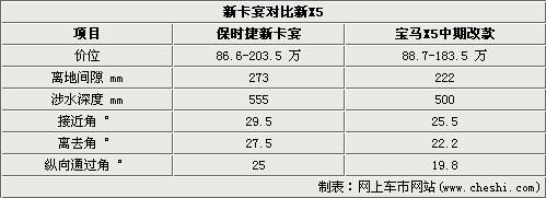 但是保時(shí)捷為卡宴標(biāo)配的空氣懸架系統(tǒng)因其能夠?qū)崿F(xiàn)車(chē)輛離地間隙的提升,因而在最大離地間隙、涉水深度以及接近角離去角的部分非常出色,相比BMW的X5來(lái)說(shuō)這部分的優(yōu)勢(shì)在一些惡略路況下就會(huì)顯得非常明顯了。